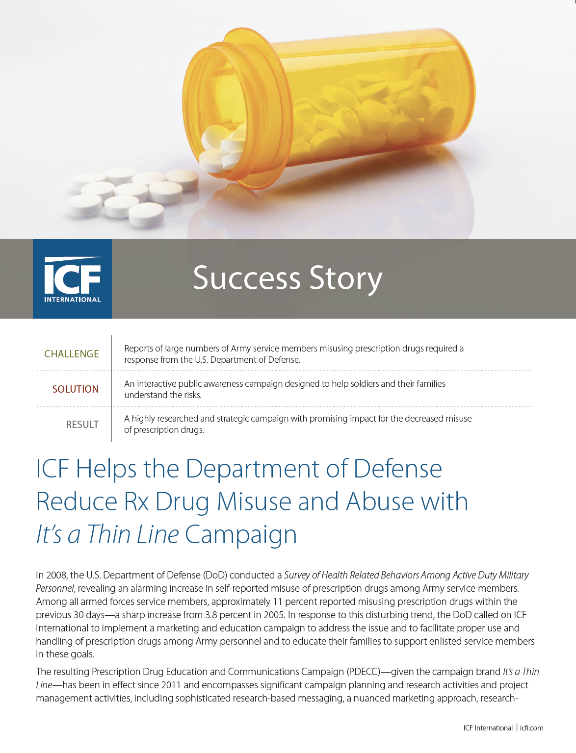ICF International needed a vehicle to communicate the success of its campaign for the Department of Defense to help combat drug misuse among active military personnel. Working with the client lead, graphic designer, and subject matter experts, I developed a success story package that included a tried-and-true text format, along with an infographic that could be easily shared across social media. These complementary communication vehicles give readers bite-size, quick content as well as more in-depth details to convey the challenge, solution, and benefit of this impactful initiative.